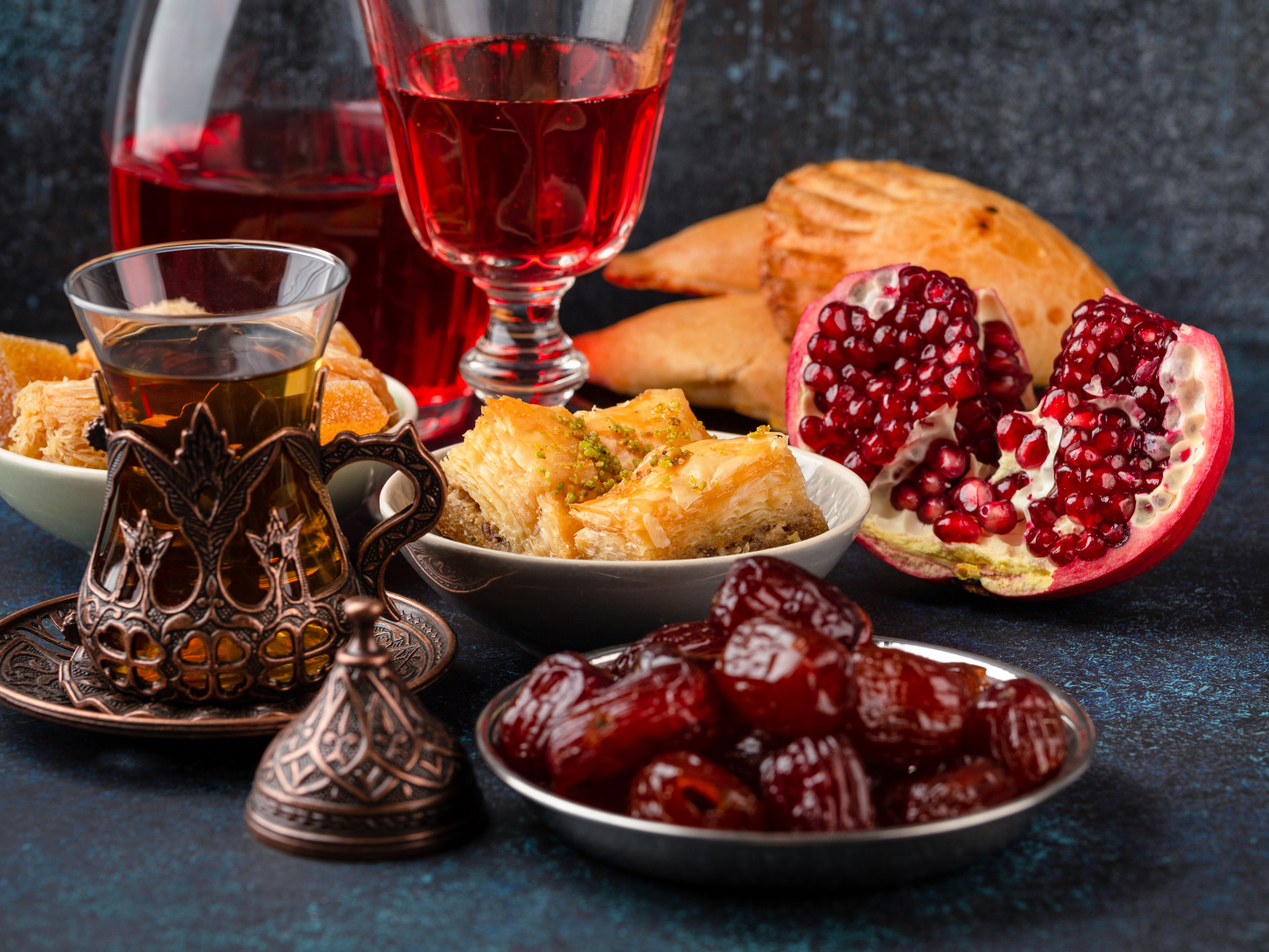 An elegant Middle Eastern dessert setup with baklava, dates, pomegranate, tea, and red juice on a dark textured surface.